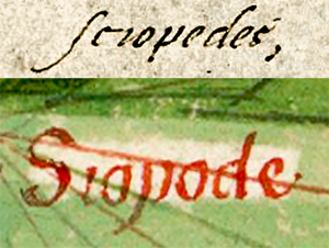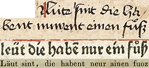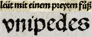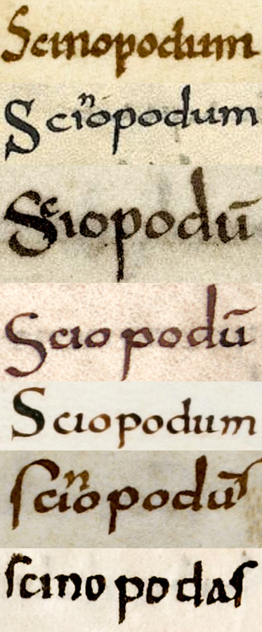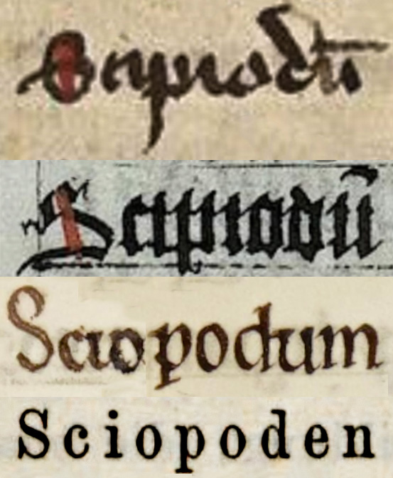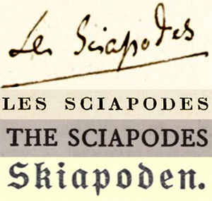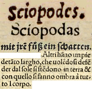 Au début des années 90, je réalisais plusieurs pièces à partir du fragment B3 d'Héraclite : une installation, projet de sculpture au CREDAC d'Ivry sur Seine, ainsi qu'une série de tableaux photographiques : Ce qui me passionnait dans ce fragment était la question (jamais résolue?) de savoir si Héraclite pensait vraiment que le soleil mesure un pied d'homme ou s'il anticipait déjà la proposition Euclidienne : "les grandeurs vues sous des angles égaux paraissent égales" Dans Le Pied, mesure du soleil je fais de l'invention du Sciapode une mauvaise interprétation du fragment 3 d'Héraclite. En effet couché sur le dos, une jambe en l'air, notre pied n'a pas besoin d'être démesuré pour occulter le soleil... Après cette première rencontre dans les textes, j'ai trouvé des images du Sciapode lors de recherches sur l'arc-en-ciel dans des manuscrits d'Histoire naturelle, de voyages dans des pays fabuleux, ou simplement comme grotesques décoratifs. J'ai voulu en savoir plus ... et trouvé nulle part confirmation de mon hypothèse. |