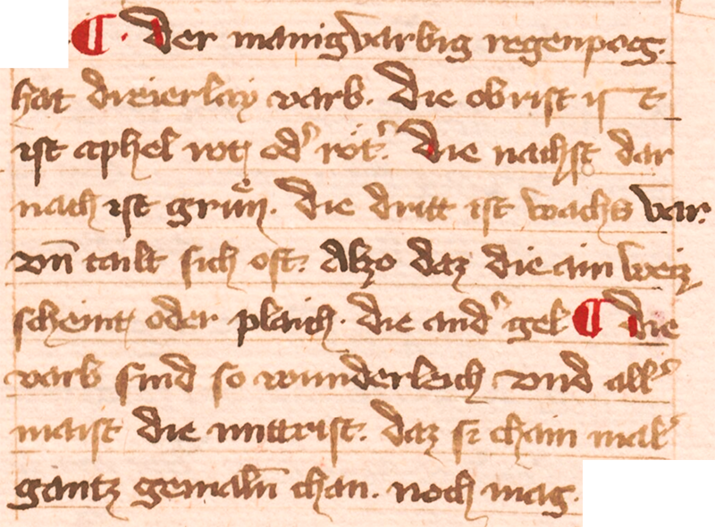 die varb sint sô wunderleich und aller maist die mitelsten , daz si kain mâler ganz gemâlen mag.