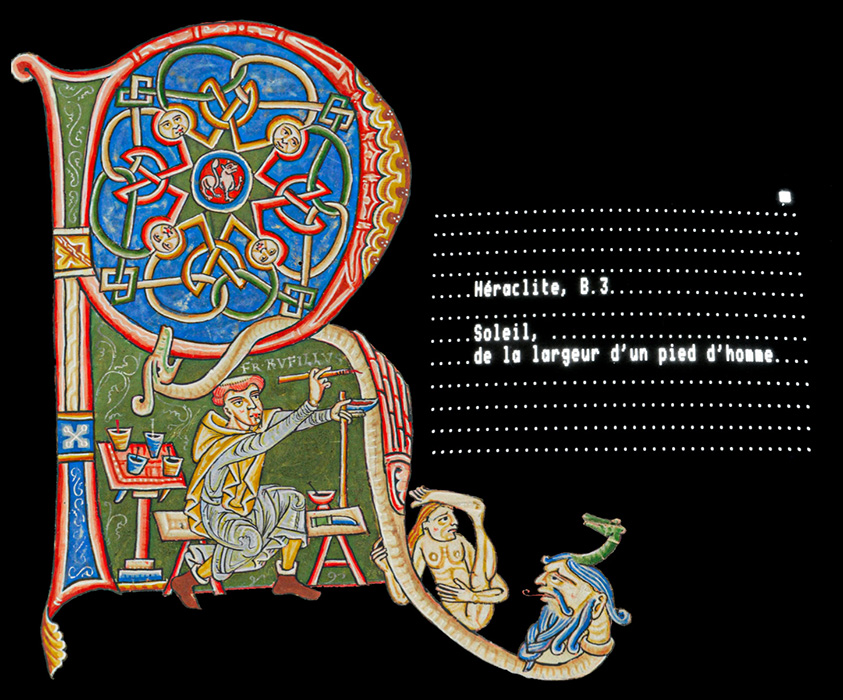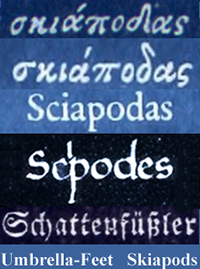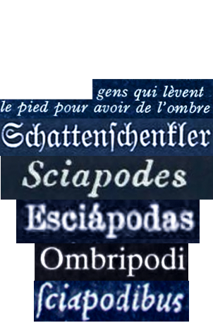 Au début des années 90, je réalisais plusieurs pièces à partir du fragment B3 d'Héraclite : une installation, projet de sculpture au CREDAC d'Ivry sur Seine, ainsi qu'une série de tableaux photographiques : Ce qui me passionnait dans ce fragment était la question (jamais résolue?) de savoir si Héraclite pensait vraiment que le soleil mesure un pied d'homme ou s'il anticipait déjà la proposition Euclidienne : "les grandeurs vues sous des angles égaux paraissent égales" Dans Le Pied, mesure du soleil je fais de l'invention du Sciapode une mauvaise interprétation du fragment 3 d'Héraclite. En effet couché sur le dos, une jambe en l'air, notre pied n'a pas besoin d'être démesuré pour occulter le soleil... Après cette première rencontre dans les textes, j'ai trouvé des images du Sciapode lors de recherches sur l'arc-en-ciel dans des manuscrits d'Histoire naturelle, de voyages dans des pays fabuleux, ou simplement comme grotesques décoratifs. J'ai voulu en savoir plus ... et trouvé nulle part confirmation de mon hypothèse. |