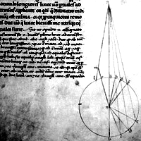 folio. 15. verso. Parchemin jaunâtre, constellé de petits points matière pelage. En haut de page, en orange pâle : Liber tertius incipit qui xxxvi theoremata côtinet. A gauche, une grande Q rouge, des entrelacs frisottis violets remplissent sa boucle & prolongent sa queue sur toute la hauteur du bord gauche. Corps du texte sur une colonne, noir, chaque phrase commence par une lettre orange pâle. En bas, face à un numéro 1, une lettrine C bleue décorée de rouge, & dessous, la figure III.1, traits gris à la règle, fin cercle noir au compas, lettres orange pâle. |