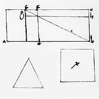| folio 20. au crayon gris. Papier beige crémeux. Tracé vertical des marges. Texte sur une colonne, gris-brun. En haut à droite .1. noir. Petites notes noires dans la marge gauche. Dans la marge droite; en haut, sous une tache de rouille, une grande figure I.47, tracée à la règle, très propre, fine, noire aux lettres noires. Le grand carré y est un rectangle; les petits carrés y sont des trapèzes obliques. |