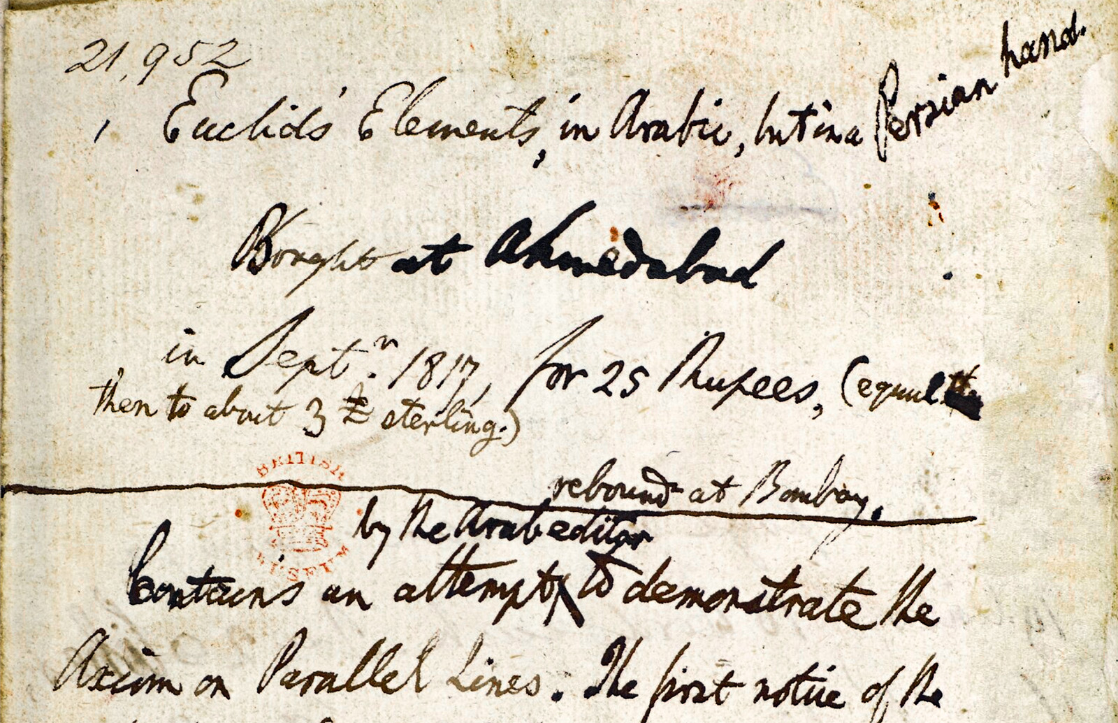 British Library, Oriental Manuscripts, Add MS 21952 Arabic version of the Elements Στοιχεῖα; الأصول by Euclid of Alexandria Εὐκλείδης, أقليدس in the annotated edition of Naṣīr al-Dīn Muḥammad ibn Muḥammad al-Ṭūsī نصير الدين محمد بن محمد الطوسي |
