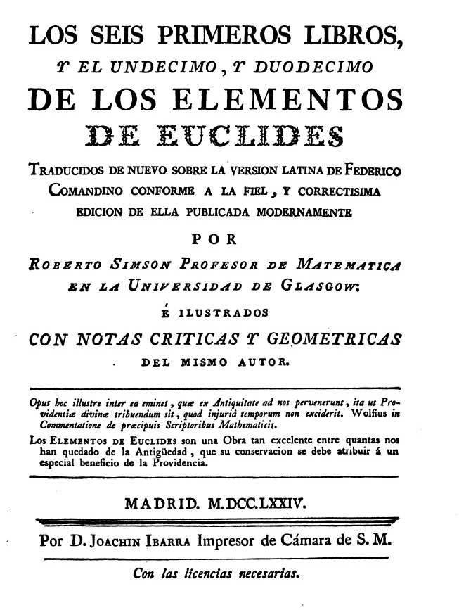 Los seis primeros libros y el undecimo, y duodecimo de los elementos de Euclides, traducidos de nueuo sobre la version latina de Federico Comandino, por Roberto Simson Profesor de Mathematicas en la Universidad de Glasgow