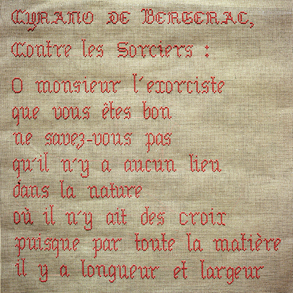 Cyrano de Bergerac, Contre les Sorciers. 1989. Photographie Couleur 120x120cm. contre-collage aluminium, cadre bois. Original : Ektachrome 6x6cm d'après tapisserie au point de croix. 1/3 Collection particulière 2/3 Collection de l'artiste. Expositions : Galerie Archives. Musée d'Art Moderne de Tel-Aviv. 1993. Tableaux Photographiques © |