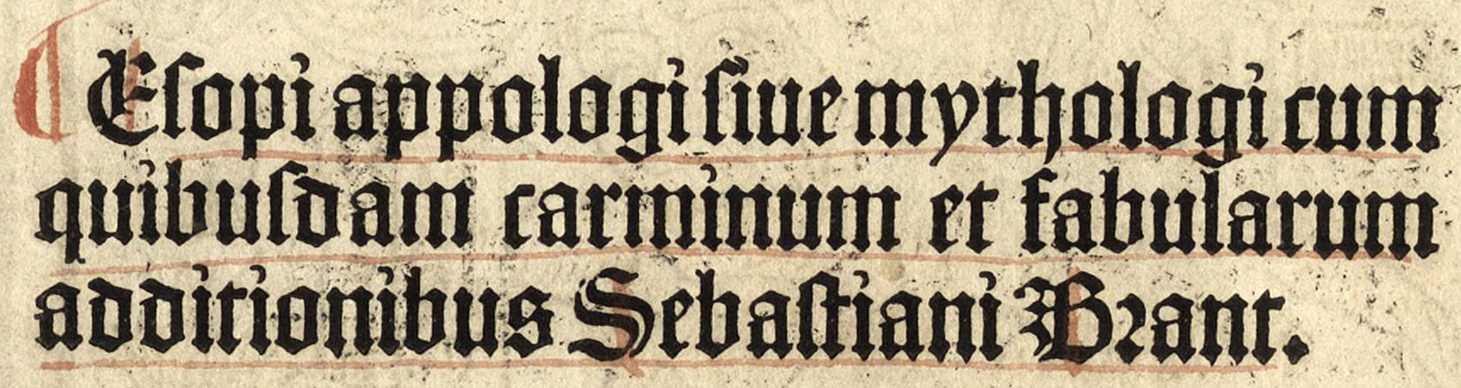 Esopi appologi siue mythologi cum quibusdam carminum et fabularum additionibus. Sebastiani Brant, Basilee, Impressi opera et impensa Jacobi de Phortzheim, 1501