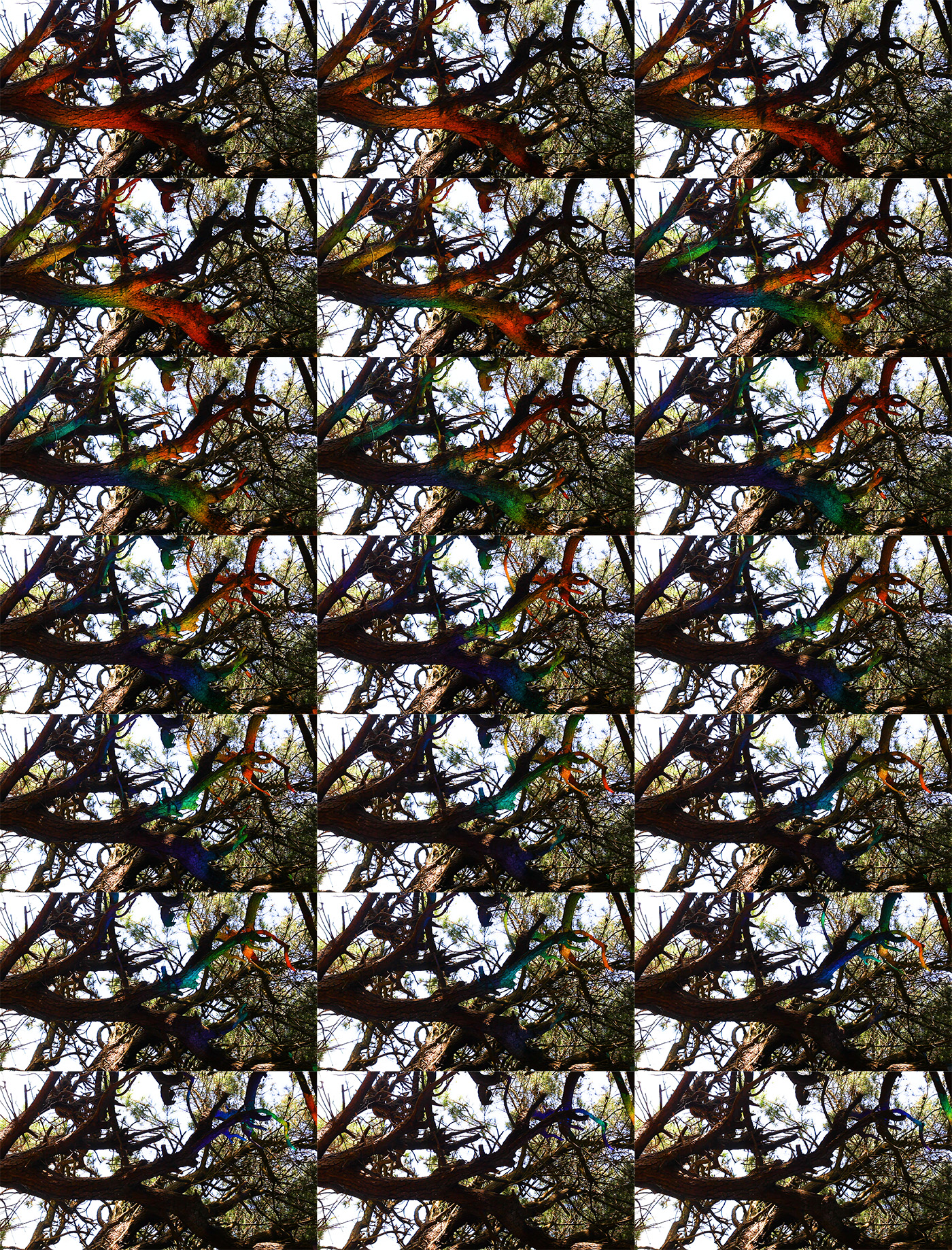 Dans le jardin, Projection par le Prisme-Abreuvoir sur le sapin, 2 avril 2019, course du soleil de 17h42 à 17h53