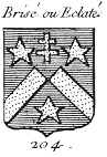 Briçonnet, d'azur, à la bande componnée d'or & de gueule, de six pieces, chargé sur le premier compon de argent d'une étoile d'or, & accompagné d'une autre étoile de même en chef. |