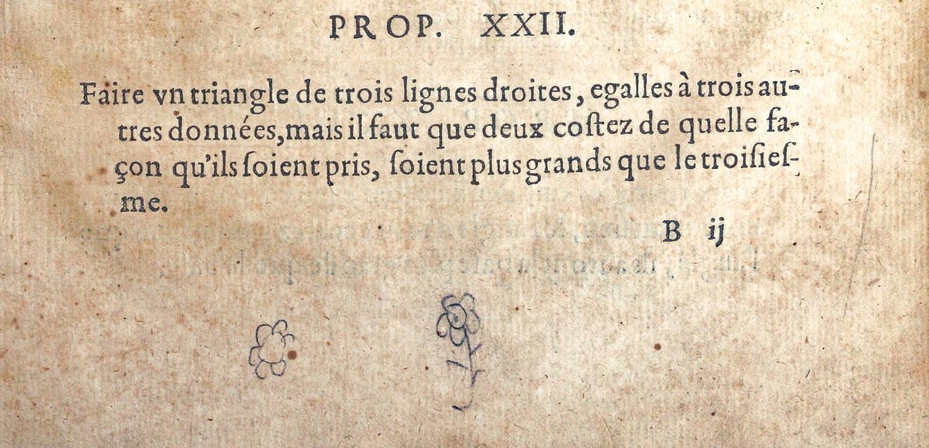 Propositis tribus rectis lineis quarum queque due simul iuncte reliqua sunt longiores, de tribus aliis rectis lineis sibi equalibus triangulorum constituere.