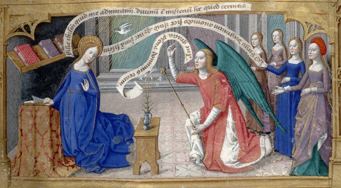 Book of Hours, Circle of the Master of Jacques de Besançon, 1480-1490, British Library, Harley 2876. folio. 7 Annunciation Aue α ? © |