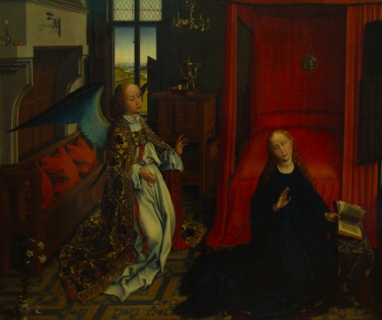 Atelier de Rogier van der Weyden, L'Annonciation, panneau central d'un triptyque aux volets conservés à Turin, huile sur bois, 1435, Paris, musée du Louvre. Navolger van Rogier van der Weyden, Annunciatie olieverf op paneel, Koninklijk Museum voor Schone Kunsten Antwerpen. Verkündigung, Öl auf Holz, 2. Drittel 15. Jh, München, Alte Pinakothek. Workshop of Rogier van der Weyden (possibly Hans Memling), Annunciation, oil on wood, 1465–75, The Metropolitan Museum of Art at New York. |