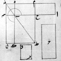 folio 57. verso. Papier grisâtre, rongé en bas. Texte sur une colonne, brun-noir. En rouge, dans le corps du texte : titre de la proposition & petits points ronds. En bas de la marge droite, la figure III.1, fine, rouge aux lettres noires, tracée à la règle et au compas. |