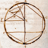 folio 44. verso Papier soie jaunâtre, taches grises. Texte sépia à brun-noir sur une colonne. Dans la marge gauche, une figure IV.12 de la même couleur que le texte, le pentagone n'arrive pas à inscrire le cercle. La figure est refaite en deux exemplaires en bas de page, brun-noir aux lettres brun-noir, cercle au compas, lignes grossières, à main levée. |