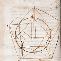 La figure a été refaite deux fois : en haut de la marge gauche, cercle fin au compas, traits à main levée, noire aux lettres noires; & au milieu du bas de page, superposée à l'empreinte d'une figure du verso, cercle très fin, gris, au compas, traits gris à noirs incomplets (manque le tracé du pentagone), lettres grises. ![]() |