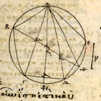 | folio 56. verso Parchemin blanchâtre, lisse. Lignes horizontales gravées. Deux colonnes de texte écriture fine, noire. Au milieu, en rouge, numéro en lettres grecques suivi d'une lettrine E. En bas, la figure IV.15 noire aux lettres noires, au compas & à main levée. Un hexagone aux traits plus épais et grossiers rajouté autour du cercle. |