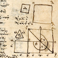 folio 33 Parchemin jaunâtre. Lignes horizontales gravées. Au bord une ligne de petits trous régulièrement espacés. Deux colonnes de texte, écriture fine, noire. En bas, une écriture plus petite, noire, puis le tampon rouge Biblioteca Medicea Laurenziana Firenze Dans le corps du texte de la colonne de gauche, la figure II.14, noire aux lettres noires, à main levée, le polygone y est un triangle. La figure est répétée, plus grossière dans le coin haut droite de la page. |